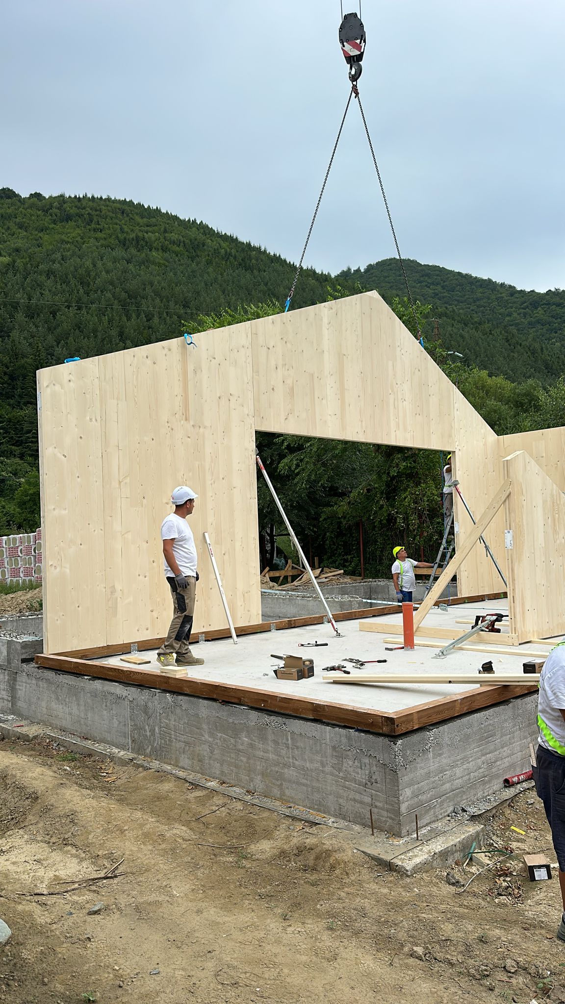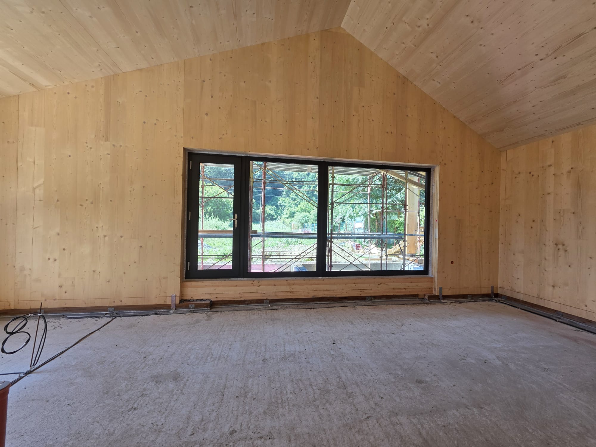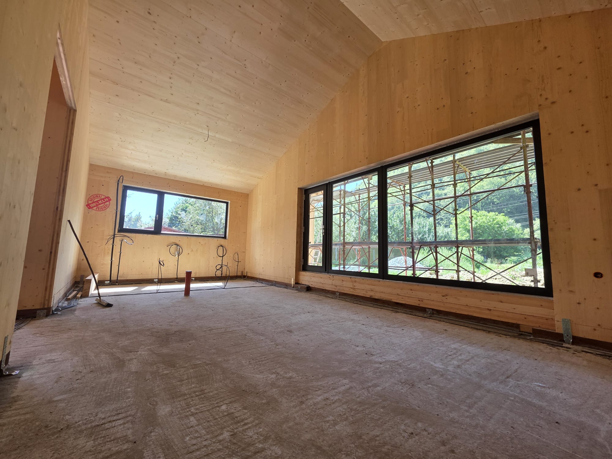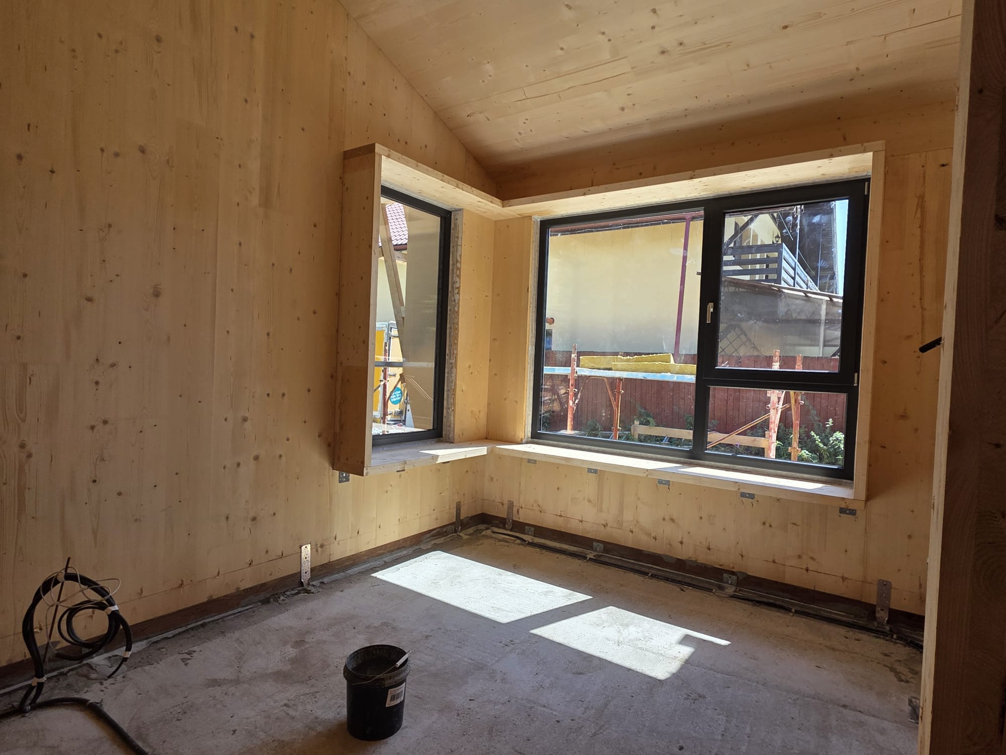 Deși amprenta la sol este redusă, spațiul interior beneficiază de o amplificare vizuală datorită acoperișului înclinat, vizibil din interior. Această geometrie deschisă contribuie la percepția de verticalitate și spațiu, oferind în același timp o identitate arhitecturală coerentă cu structura din CLT.